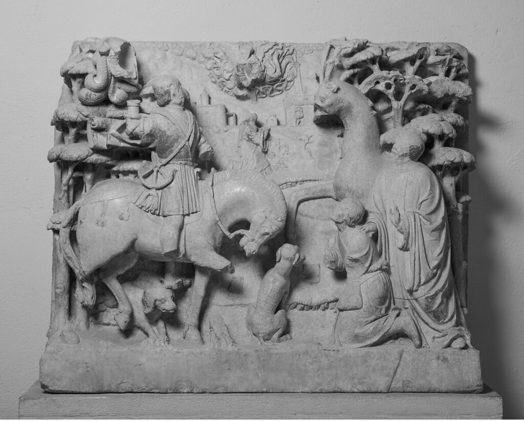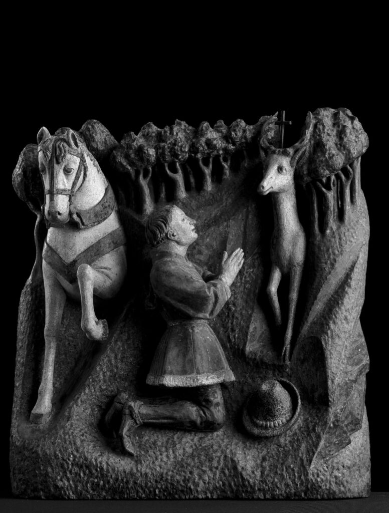 Though rooted in hagiographic tradition, such reliefs were often produced for secular settings—castle chapels or great halls—where the image of the kneeling hunter conveyed ideals of humility, virtue, and the moral discipline of aristocratic life.