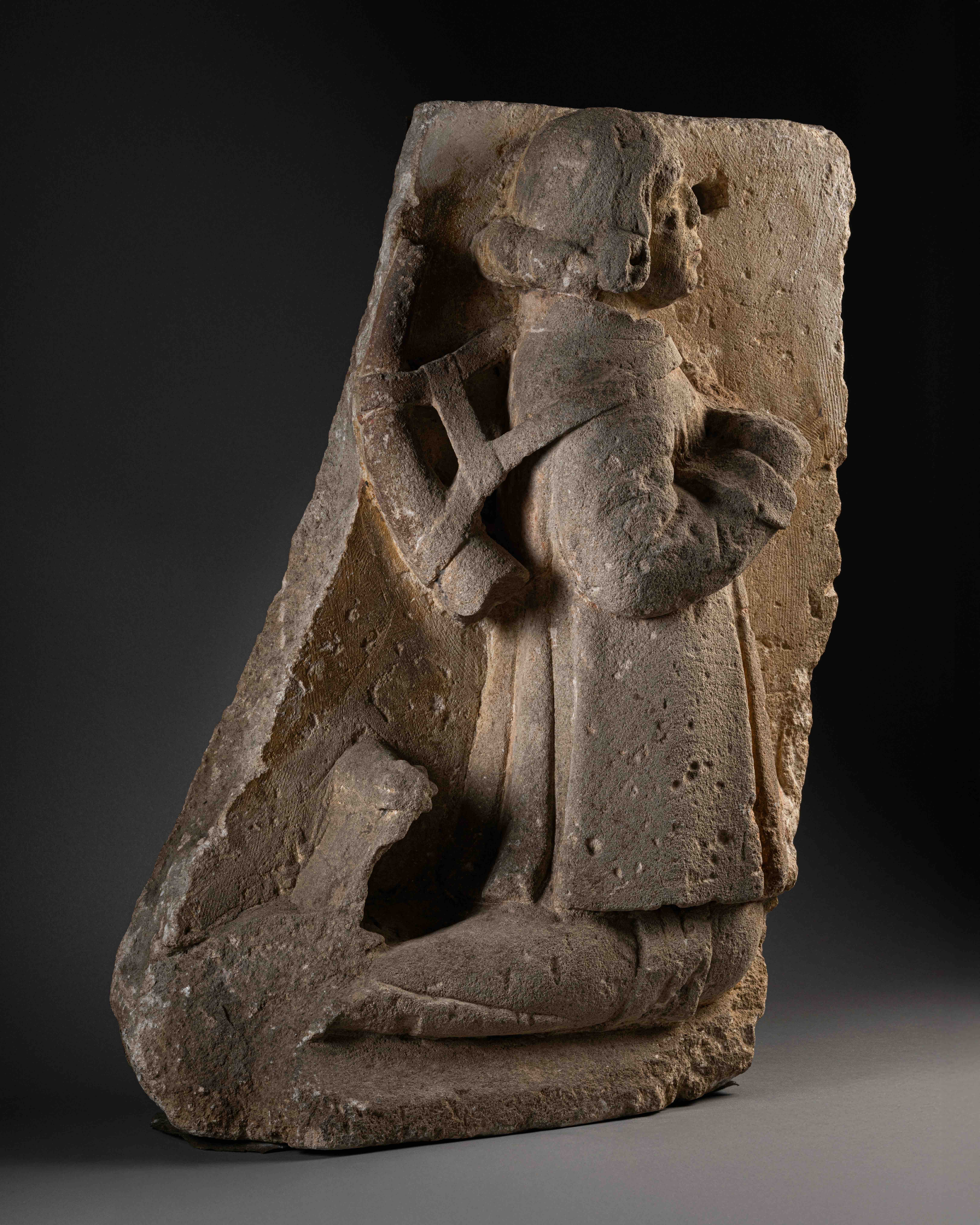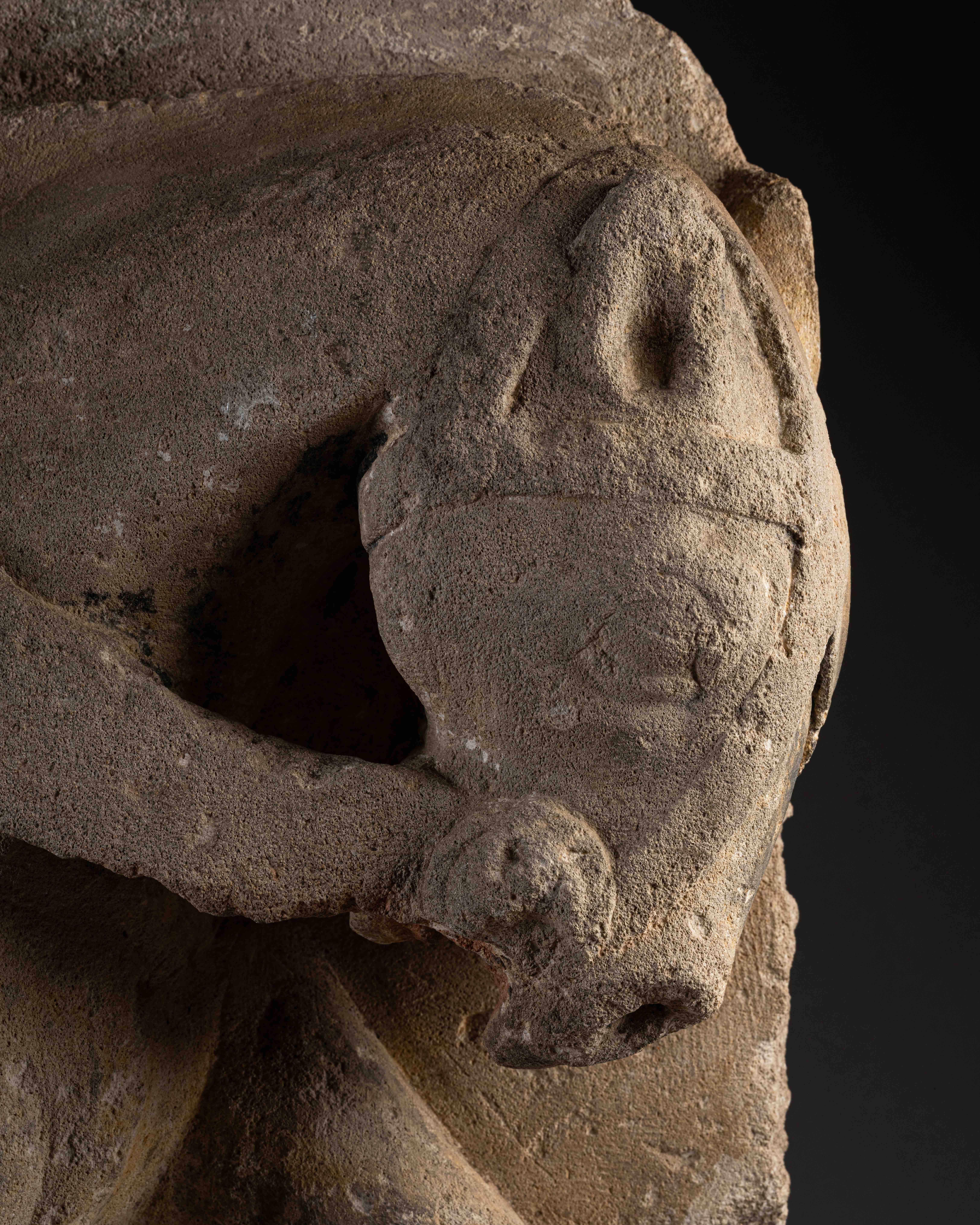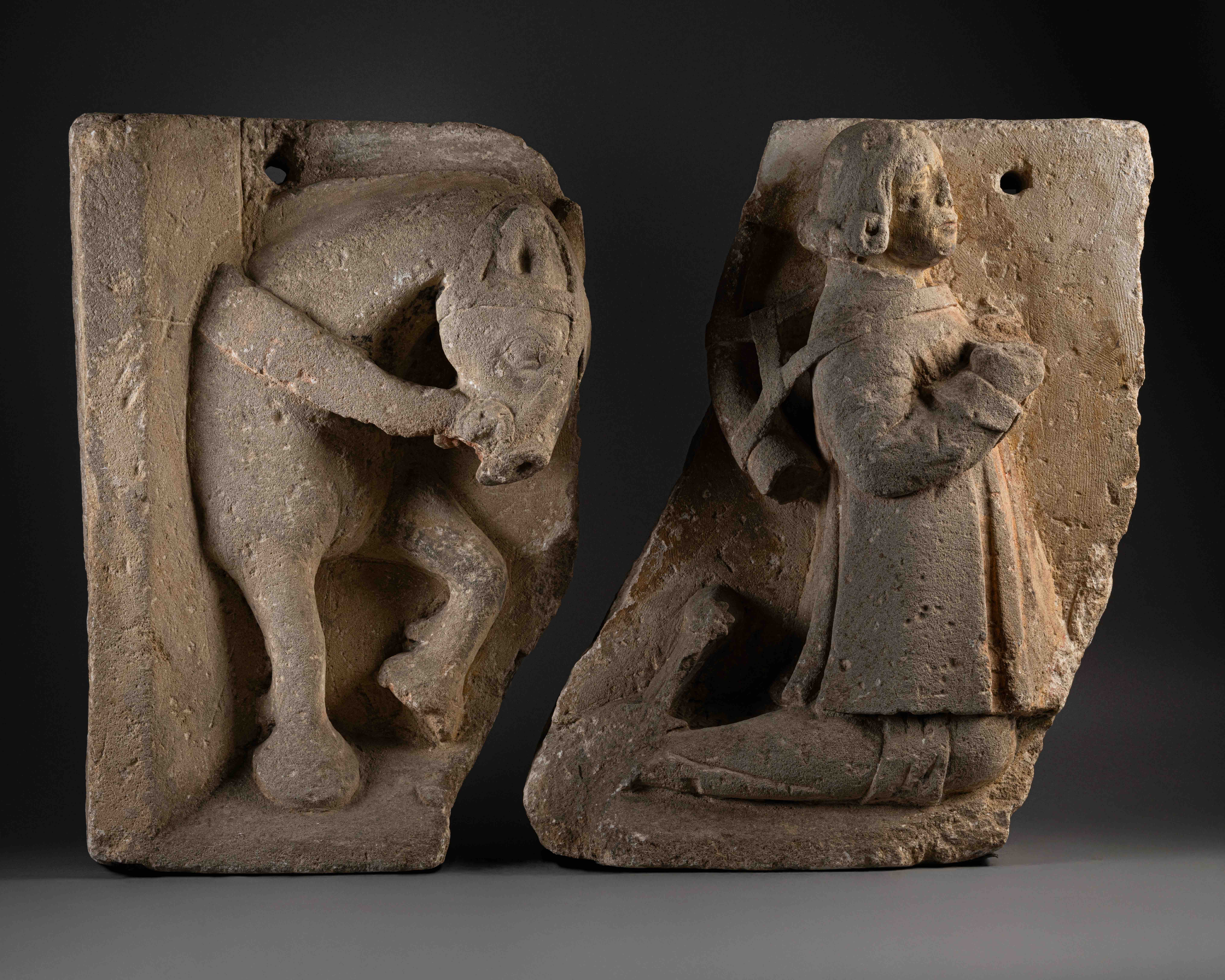 These finely carved fragments—showing a richly harnessed horse and a kneeling nobleman—once formed part of a relief depicting the vision of Saint Hubert and the Stag. Executed in the late Gothic style of Northern France or the Low Countries, they display notable precision of detail: the hunter’s aristocratic attire, complete with oliphant, marks his noble rank, while the bridled and saddled horse evokes the splendour of late medieval courtly hunting.