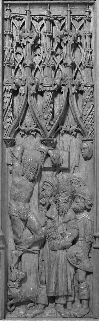 In keeping with established iconography, the thieves are bound to rough tau-shaped trunks (cruces commissae), their arms secured behind the crossbeam. This austere configuration, together with the simply knotted perizonia, underscores the stark devotional tenor of Northern late Gothic imagery.