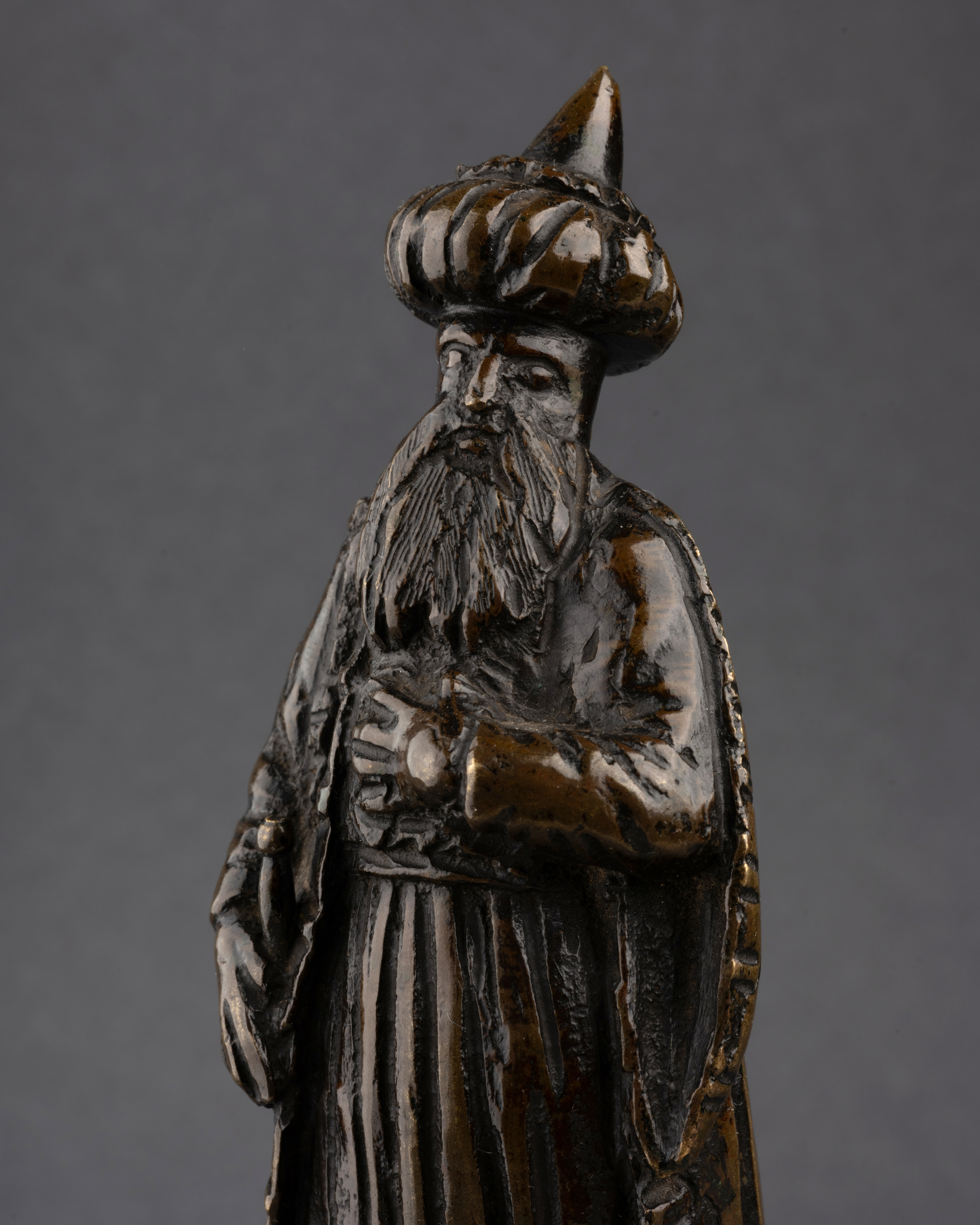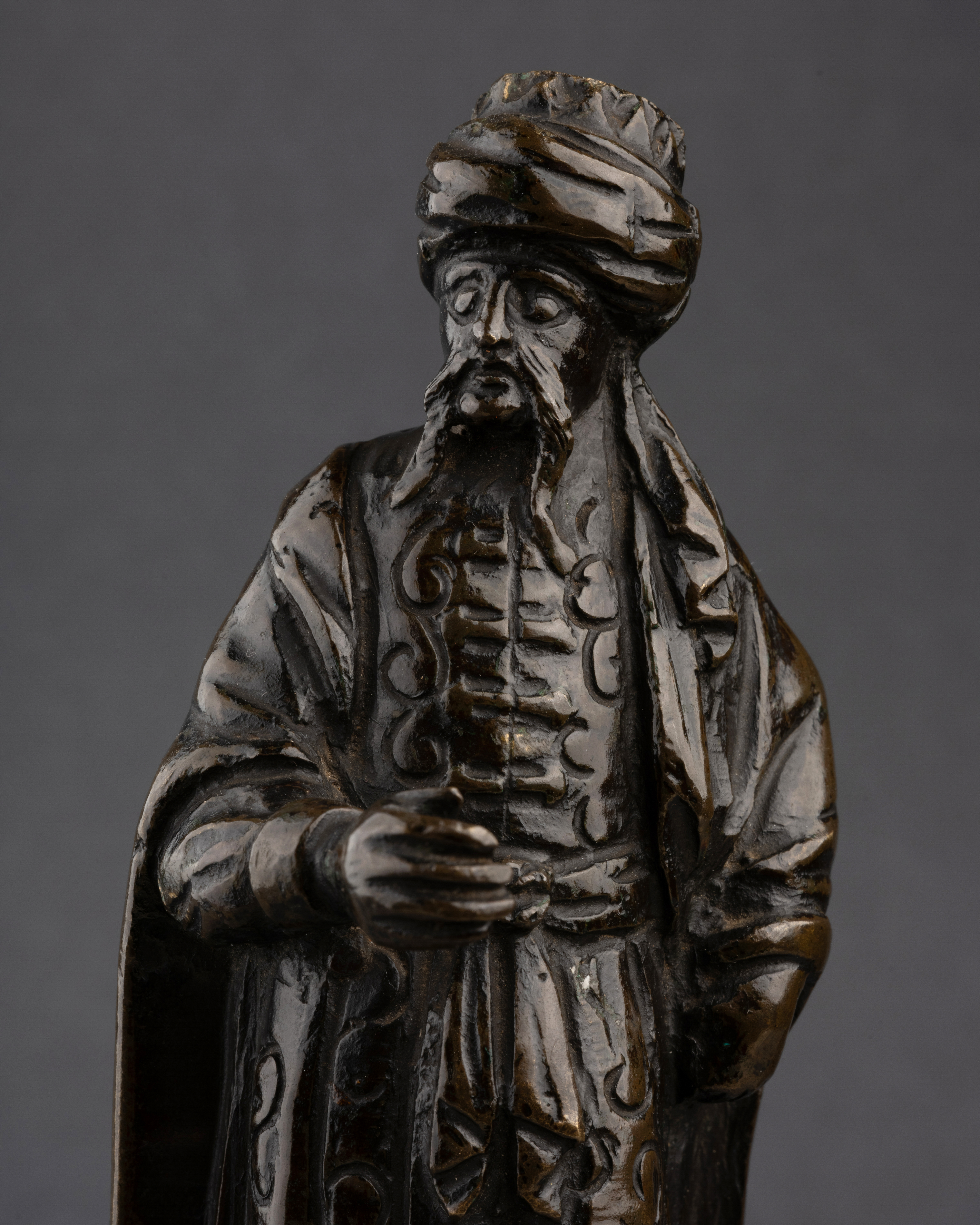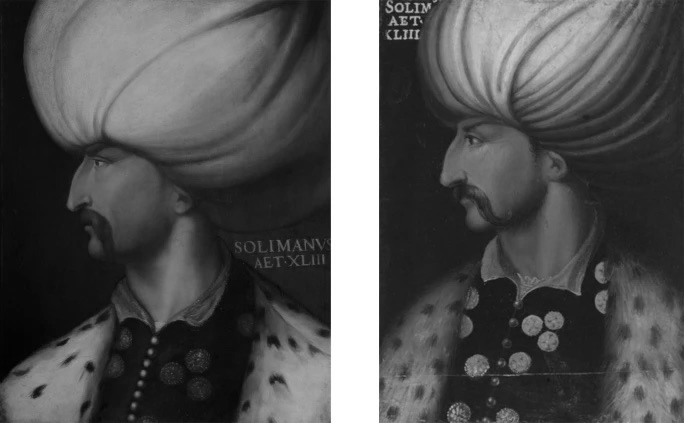 The statuettes may represent Suleiman the Magnificent at two different stages of life, as both young and old. The sultan depicted alongside the winged lion corresponds to a description from a Venetian delegate in 1534, when Suleiman was 43. At that time, he had conquered Iraq from the Safavids and achieved a decisive victory over the Papal fleet at the Battle of Preveza. He was described as having large eyes, an aquiline nose, and long red mustaches—traits visible in Cristofano dell’Altissimo’s portrait of Suleiman in the Uffizi Gallery in Florence.